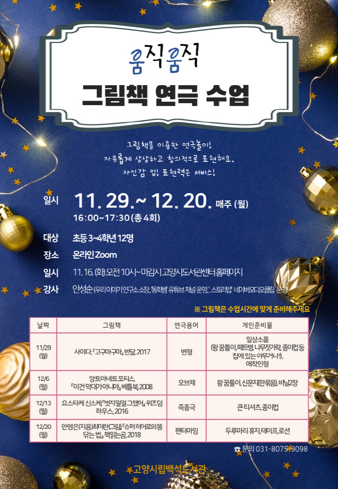 연극 수업은 11월 29일 ‘변형’, 12월 6일 ‘오브제’, 12월 13일 ‘즉흥극’, 12월 20일‘팬터마임’ 순서로 진행된다. 각 회차별 그림책은 수업 시간에 읽으므로 미리 읽지 않아도 되지만 나무젓가락, 신문지 등의 준비물은 개인이 준비해야 한다.