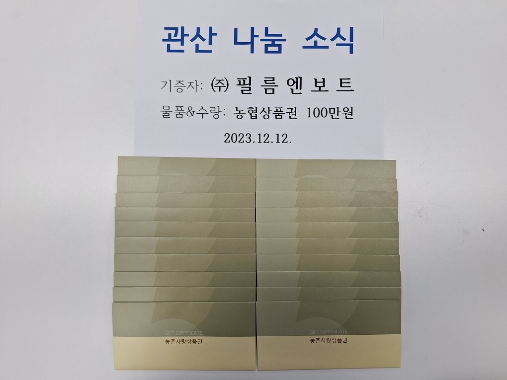 김기세 관산동장은 “㈜필름엔보트의 사려 깊고 따뜻한 기부에 감사드리며, 관산동의 어려운 이웃들이 겪을 추운 겨울을 녹일 수 있는 따뜻한 마음이 담긴 상품권을 잘 전달하도록 하겠다.”라며 감사의 인사를 전했다.