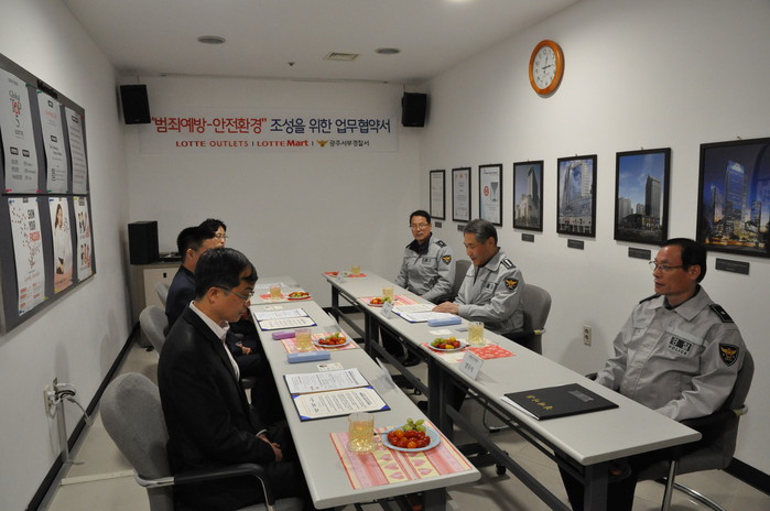 | △광주서부경찰서는 롯데아울렛 회의실서 서부경찰서장, 롯데아울렛광주월드컵, 롯데마트광주월드컵은, 범죄예방환경조성업무협약(MOU)를 체결하였다 |