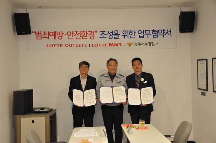 광주서부경찰은 '17년 3월31일(금) 15:00, 롯데아울렛 회의실에서 서부경찰서장(총경 이유진), 롯데아울렛광주월드컵(점장 김태회), 롯데마트광주월드컵(점장 이성열)은, 범죄예방환경조성업무협약(MOU)를 체결하였다.