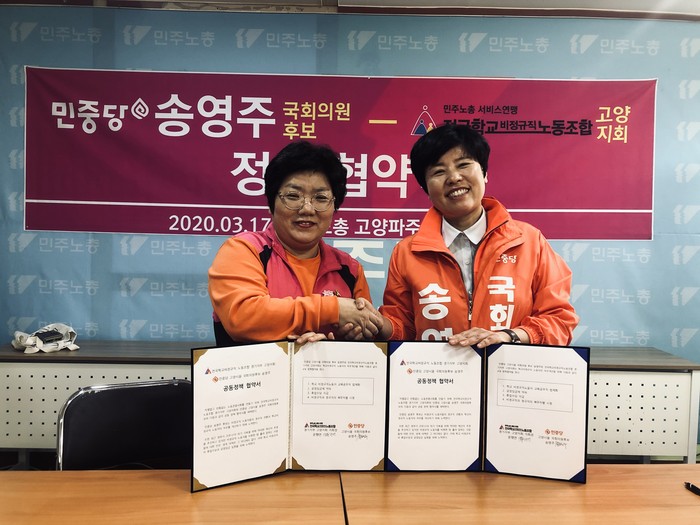 고양시 초중고 학교에서 근무하는 비정규직 노동자들과 송영주 후보는 ‘학교 비정규직노동자의 교육공무직 법제화’, ‘공정임금제’, ‘휴업수당 지급’, ‘비정규직 정규직 복무차별 시정’을 약속하는 협약서에 함께 서명하며 21대 총선을 함께 대응하기로 했다.