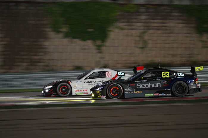 [사진설명] 2021년 나이트레이스에서 삼성화재 6000 클래스 레이스 차량들이 어둠속에서 질주하고 있다.