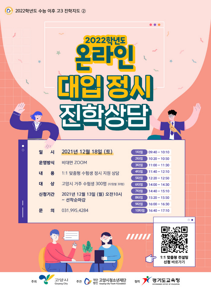‘고양시 2022학년도 대입 정시 진학상담’ 사전 접수신청 및 기타 자세한 사항은 고양시 청소년진로센터 홈페이지 혹은 대표전화로 문의하면 된다.