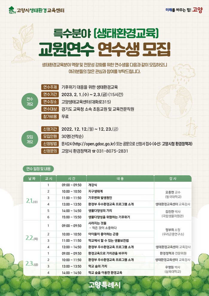 이번에는 교사를 대상으로 지속가능한 생태환경교육 15시간 연수과정으로 겨울방학인 2023년 2월 1일부터 3일까지 3일간 실시할 예정이다. 연수는 경기도 교육청 소속 초등교원 및 교육전문직원 30명 대상이며, 이론교육과 체험교육으로 진행되며, 특히 환경부에서 지정받은 고양시의 우수 프로그램을 학교에서 활용 가능하도록 구성했다.