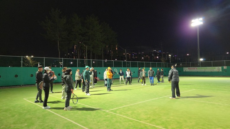 | ▲ 지난 3월 3일 미사한강공원 테니스장에서 개최된 서울시테니스협회 장나라 감독의 테니스 특강에 참여한 시민들이 설명에 귀를 기울이고 있다. |