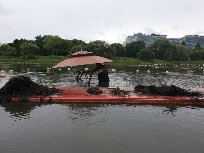 [사진 설명] 호수 저면 청소를 하는 모습.