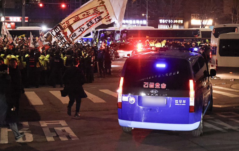 내란 우두머리 혐의로 체포된 윤석열 대통령의 구속 전 피의자심문(영장실질심사)이 종료된 18일 서울 마포구 서울서부지법 인근에서 윤 대통령이 탄 법무부 호송차량이 서울구치소로 향하고 있다. 2025.1.18 [공동취재]