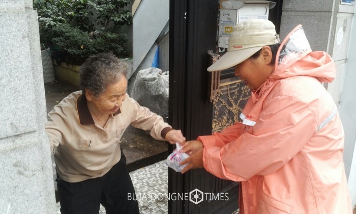 | △ 한국야쿠르트 직원이 광주시 동구 지원1동 독거어르신에게 '사랑의 야쿠르트'를 전달하고 있다. |
