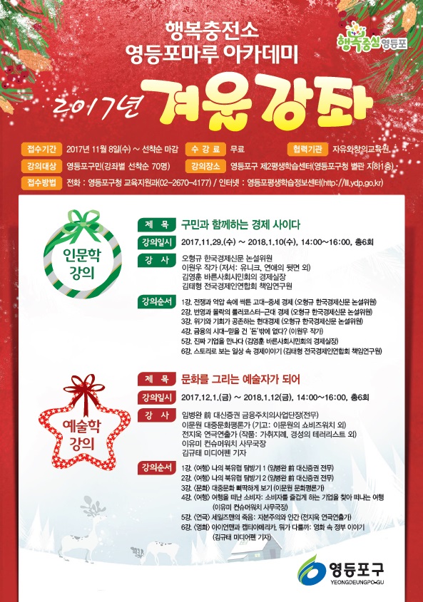 [부자동네타임즈 이병도 기자]영등포구가 다가오는 겨울을 따뜻하고 풍성하게 채워줄 무료 인문.예술학 강좌를 마련해 눈길을 끈다.