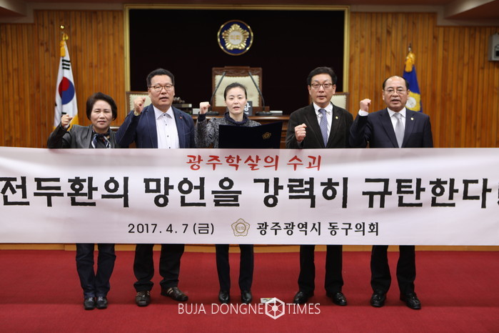 광주시 동구의회(의장 박대현)는 2017. 4. 7(금) 본회의장에서 "광주학살의 수괴, 전두환의 망언을 규탄한다"는 성명서를 발표했다.