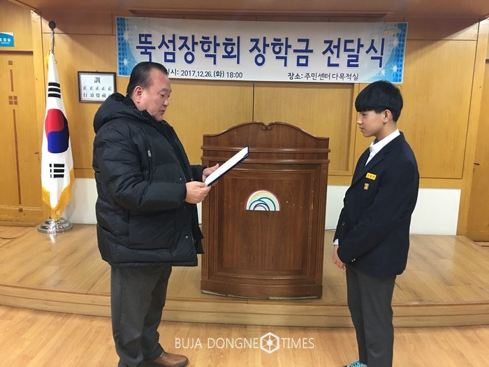 [부자동네타임즈 이병도 기자]성동구(구청장 정원오) 성수2가제1동 뚝섬장학회(회장 이흥수)에서는 지난해 12월 26일 지역 내 저소득 학생들의 면학장려와 지역인재 양성을 위해 성수2가제1동 주민센터 다목적실에서 2017년 하반기 장학금 전달식을 개최하여 중·고등학생들 21명에게 총 730만원의 장학금을 증서와 함께 전달했다.