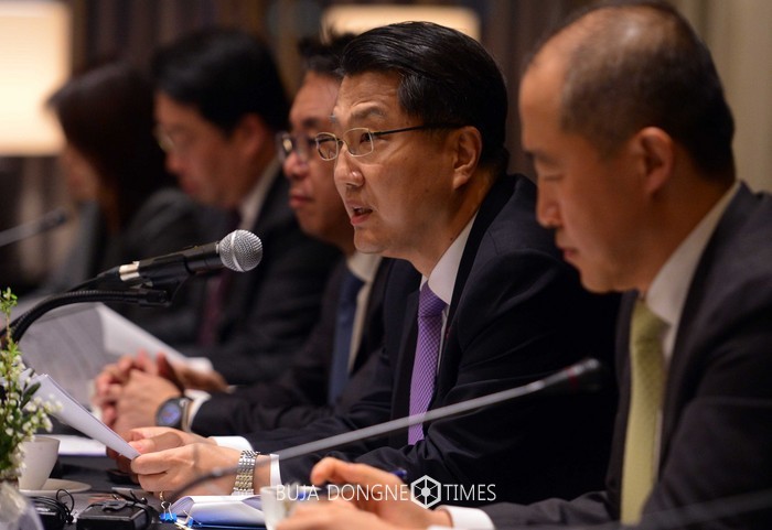 진웅섭(오른쪽 두번째) 금융감독원장이 24일 오전 서울 여의도 콘래드호텔에서 열린 외국계 금융회사(금융투자회사) CEO 조찬간담회에서 모두발언을 하고 있다. 이번 간담회에 참석자들은 재산상 이익 제공 관련 규제완화, 외국계 금융회사에 대한 최다 출자자 적격성 심사 완화 등과 애로 및 건의사항을 청취하고 올해 대내외 주요 리스크 요인 및 전망에 대해 토론했다. 2017.01.24.