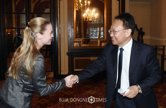 뉴욕 한국경제설명회(IR) 개최로 미국을 방문 중인 유일호 부총리 겸 기획재정부 장관이 9일(현지시간) 보스톤 페어몽 호텔에서 열린 투자자 그룹 미팅에서 참석자와 악수를 하고 있다. 2017.01.10.(사진=기획재정부 홍보실 제공)