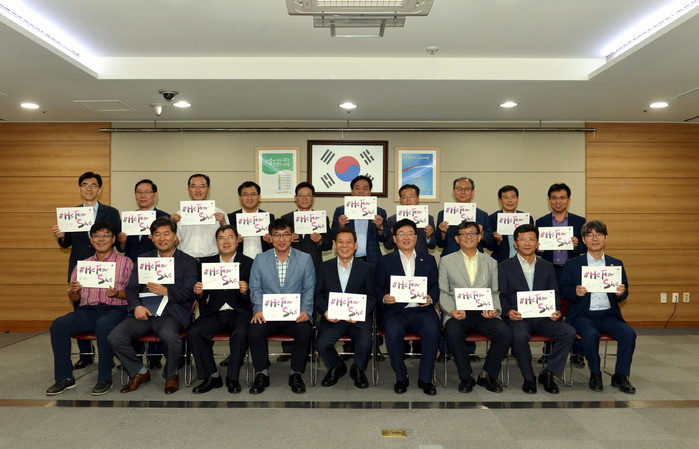 | △ 윤장현 시장(앞줄가운데), 시 남성 간부들과 양성평등 글로벌 캠페인 참여 |