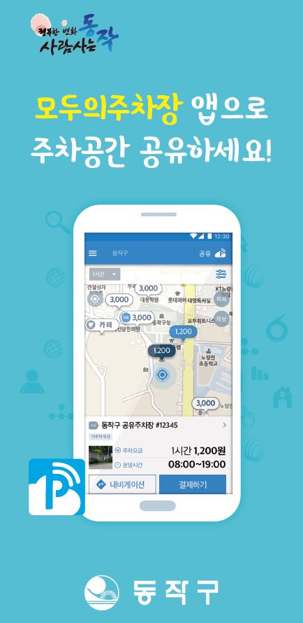 어플을 실행하면 지도화면에 주차가능 위치가 표시되고, 주차장 선택과 이용시간 설정, 결제까지 간단한 터치로 이용할 수 있어 주민들의 만족도가 높다.