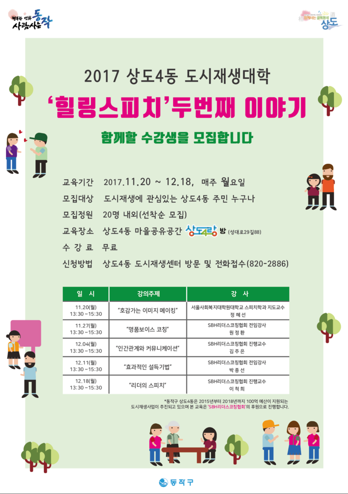 [부자동네타임즈 이병도 기자]동작구가 오는 12월까지 ‘너랑나랑 상도4랑방’에서 상도4동 도시재생대학 ‘힐링스피치’ 두 번째 강의를 진행한다고 21일 밝혔다.