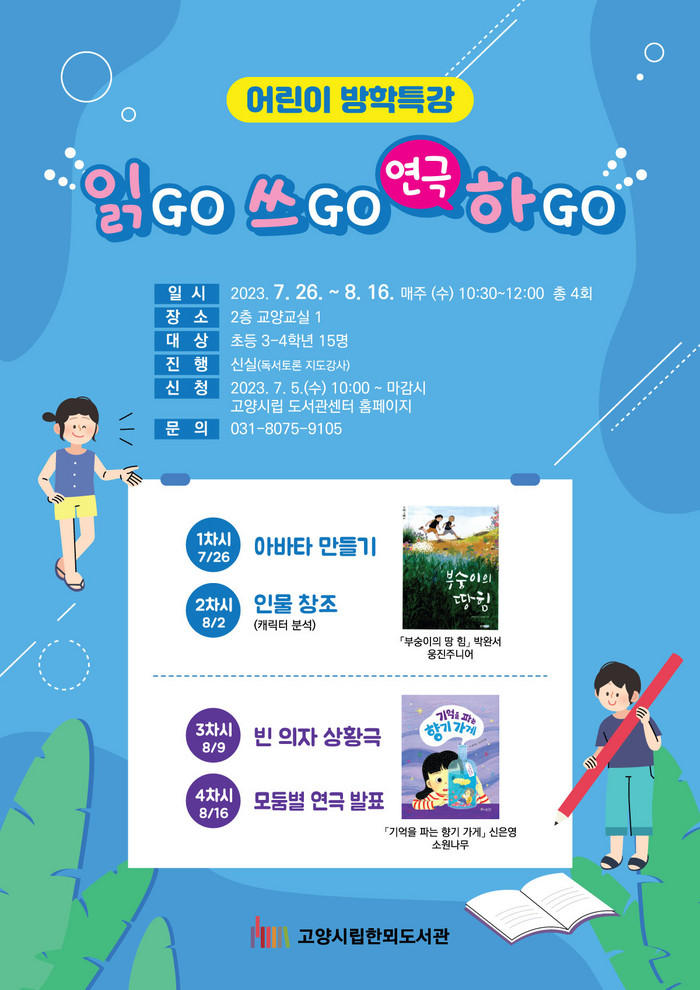 [부자동네타임즈 김인수기자] 한뫼도서관이 방학을 맞이한 어린이의 독서 습관과 문해력을 길러주기 위해 오는 7월 26일부터 8월 16일까지 매주 수요일 어린이 방학특강 「읽GO 쓰GO (연극) 하GO」를 운영한다.