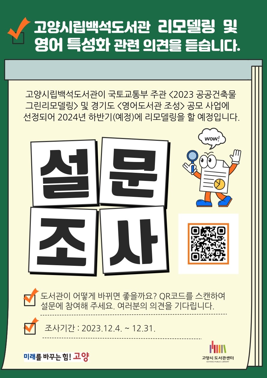 시민 의견 조사는 12월 4일부터 12월 31일까지 온라인으로 진행된다. 고양시 도서관센터 누리집 및 20개 시립도서관 방문 게시판을 통해 조사에 참여할 수 있다. 설문 항목은 ▲시민이 바라는 리모델링 콘셉트 ▲도서관 서비스 대상 ▲도서관 서비스 내용의 중요도 등 9개 항목이다.