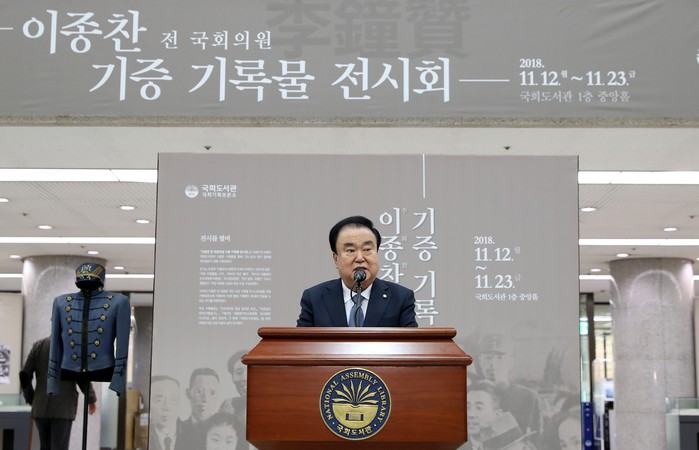 [부자동네타임즈 조영재 기자]문희상 국회의장은 11월 12일(월) 오후 국회도서관에서 열리는 이종찬 전 국회의원 기증기록물 전시회에 참석해서 축하의 말을 전했다.