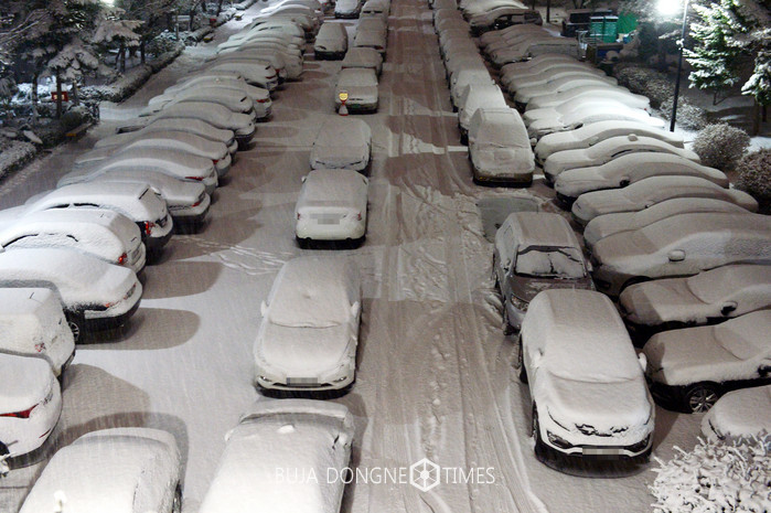 큰 추위라는 뜻의 절기상 대한이자 많은 눈이 내린 20일 오전 서울 강동구 둔촌동의 한 아파트에 주차장에 많은 눈이 내려 차량 위에 쌓여 있다. 2017.01.20