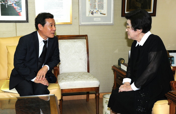 [광주=부자동네타임즈 손권일 기자] 윤장현 광주광역시장이 김대중 전 대통령 서거 6주기를 맞은 18일 오후 서울 마포구 사저에서 이희호 여사를 예방하고 있다.