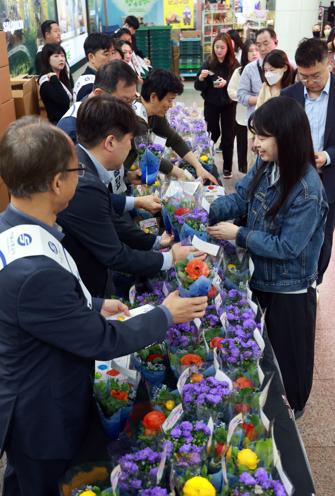 [부자동네타임즈 = 이언금 기자] 16일 서울 광화문역 3번 출구 인근 대합실에서 서울교통공사 관계자들이 시민들에게 꽃 화분 무료 나눔 행사를 하고 있다. 서울교통공사와 고양국제박람회재단과 함께 주최한 이번 행사는 출근길 시작을 응원하고 봄나들이 시기 대중교통 이용을 자연스럽게 유도하기 위해 추진됐다. 2026.4.16