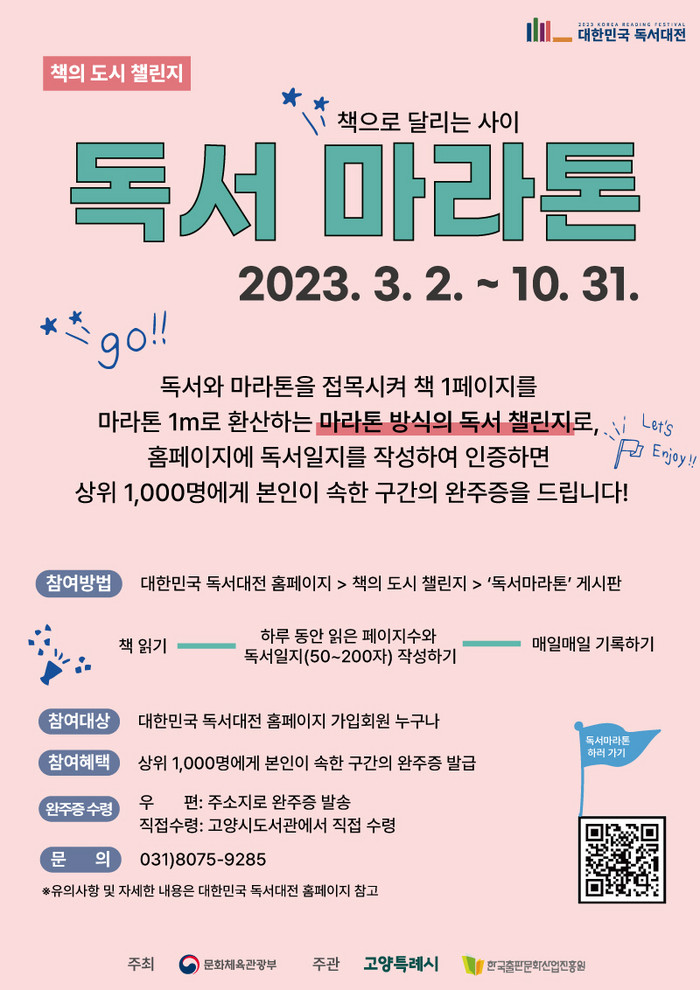 이동환 고양특례시장은 “매일 조금씩 책을 읽고 그 기록을 쌓아간다면 어느새 독서습관과 함께 성취감도 얻을 수 있으리라 생각된다. 보다 많은 시민들이 마라톤 완주의 기쁨을 누릴 수 있길 바란다 ”고 말했다.