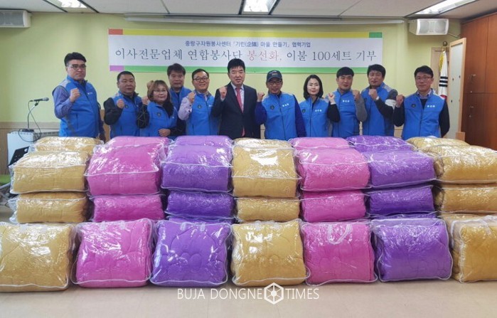 [부자동네타임즈 이병도 기자]중랑구(구청장 나진구)는 지난 13일 이사 전문업체 연합봉사단인‘봉선화’에서, 홀몸어르신들의 따뜻한 겨울나기를 위해 이불 100세트를 기부했다고 밝혔다.