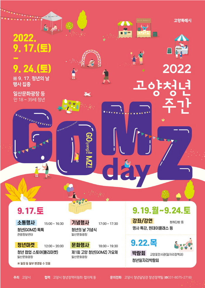 [부자동네타임즈 김인수기자] 고양특례시(시장 이동환)가 오는 9월 17일부터 24일까지 2022년 청년주간행사 ‘GOMZ(Goyang MZ) day’를 개최한다.
