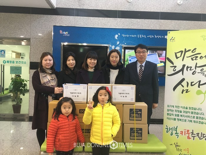 [부자동네타임즈 이현석 기자]가을아트스토리(원장 김가을)와 나눔맘(회원 김진옥, 서영아, 윤수경, 조미옥)은 1월 6일 배방읍 행복키움추진단(단장 오병국)에 크레파스 65세트(총 55만원 상당)를 전달했다.