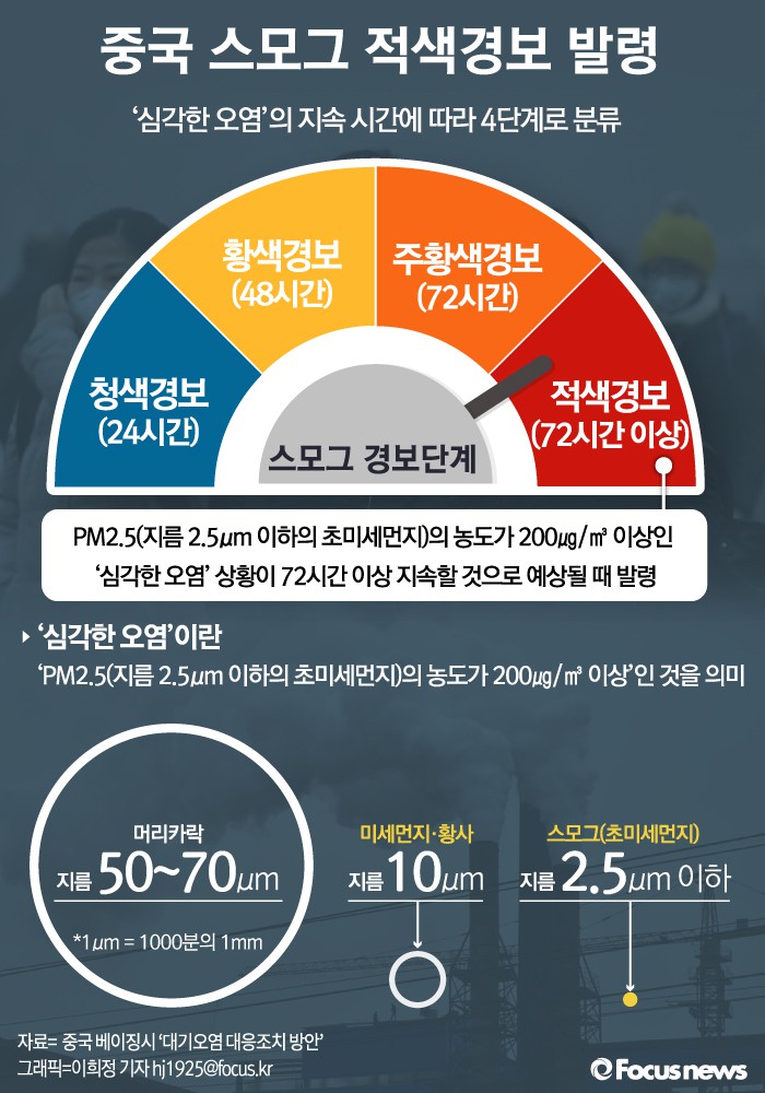 앞서 베이징 교육 당국은 학생들의 건강을 염려해 유치원과 초등학교, 중학교 등 각급 학교에 3일간 휴교할 것을 권고한 바 있다. 8일 오전 7시에 발효된 베이징 적색경보는 오는 10일 정오까지 이어질 예정이다.