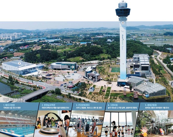 아산시 환경과학공원은 과학관, 생태곤충원, 생활자원처리장, 전망대까지 갖춘 친환경생태공원이다. 조형물과 넓은 녹지, 자연생태연못이 조성된 힐링공간이다. 150m 높이 그린타워 전망대, 60미터 길이 LED 미디어파사드도 설치되어 있다. 2019년 개장한 평택에코센터(오썸플렉스)에는 다목적체육관, 야외골프연습장, 야구장, 수영장, 문화센터가 있다.