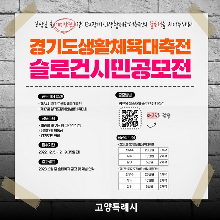 [부자동네타임즈 김인수기자] 고양특례시(시장 이동환)가 2023년 9월 개최되는‘제34회 경기도생활체육대축전’과‘제17회 경기도장애인생활체육대회’의 슬로건을 공모한다.