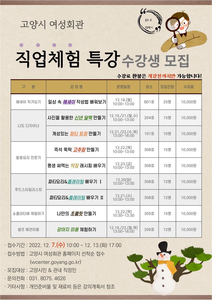 [부자동네타임즈 김인수기자] 고양특례시(시장 이동환) 여성회관이 연말에 특별한 경험을 할 수강생을 모집한다.