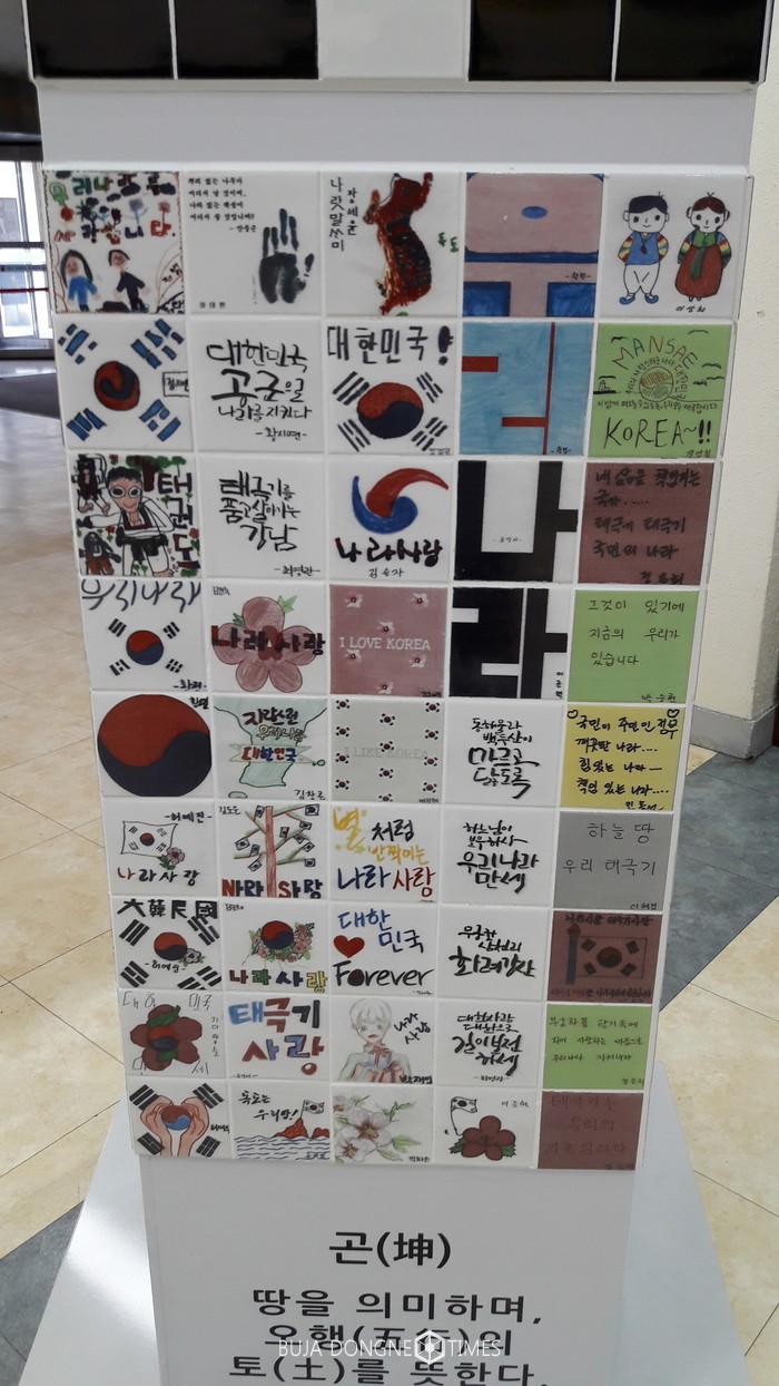 또 지난 9월 23일, 820여 명의 주민, 자원봉사자 등이 참여해‘우리가 만든 태극탑’조형물을 제작하며 나라사랑 마음을 되새겼다. 이 탑은 높이 1.9m의 건, 곤, 감, 리를 나타내는 조형물 4개와 높이 1.1m의 태극 조형물, 총 5개의 조형물로 이뤄졌다. 가로 10㎝, 세로 10㎝ 크기의 820개 타일에는 나라사랑에 관한 글이나 그림 등을 자유롭게 표현했다. 10월 31일까지 구청 본관에서 전시를 끝내고 현재는 동별로 학교, 문화센터 등에서 순회 전시 중이다.