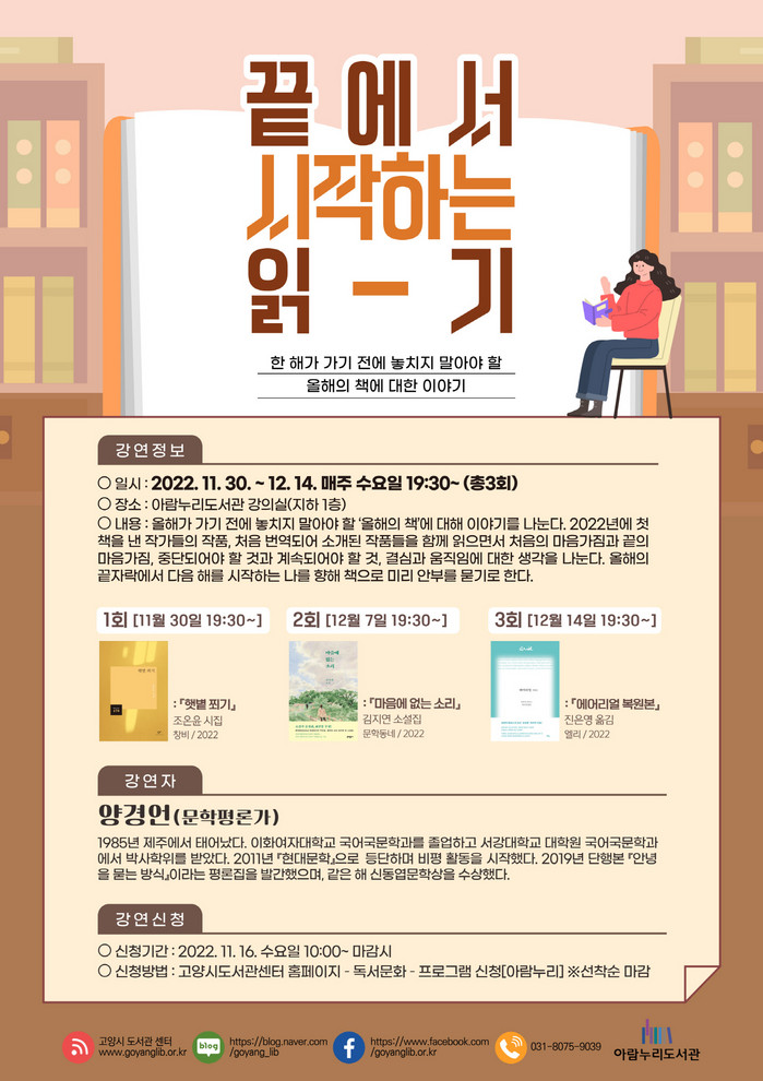 [부자동네타임즈 김인수기자] 고양특례시(시장 이동환) 아람누리도서관이 독서문화프로그램 끝에서 시작하는 읽기를 오는 11월 30일부터 12월 14일까지 매주 수요일 저녁 7시 30분, 3차시에 걸쳐 운영한다.