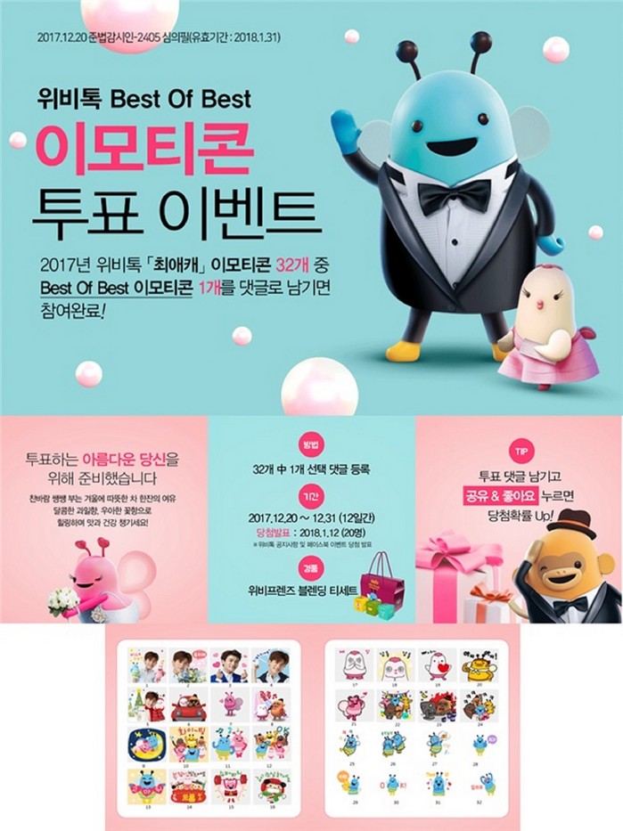 이번 이벤트는 12월 31일까지 우리은행 페이스북에서 32개의 후보 이모티콘 중에서 1개를 선택해 댓글을 남기면 자동 응모되며, 추첨을 통해 20명에게 ‘위비프렌즈 블렌딩 티세트’를 제공한다. 후보 이모티콘은 위비의 일상, 위비의 표정, 3D 위비프렌즈, 위비프렌즈의 대학생활, 위비프렌즈의 겨울이야기, 콜라보레이션 이모티콘인 박형식과 위비프렌즈 등 32개이고, 당첨자는 내달 12일 위비톡 공지사항 및 우리은행 페이스북을 통해 발표할 예정이다.
