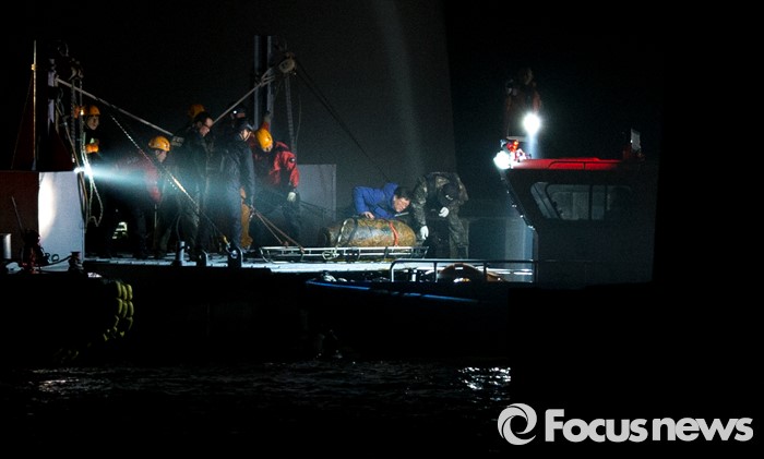 (서울=포커스뉴스) 11일 새벽 서울 한강철교 남단에서 소방당국과 한강경찰대가 한국전쟁 당시 미 공군이 투하했던 불발탄을 인양해 살펴보고 있다.