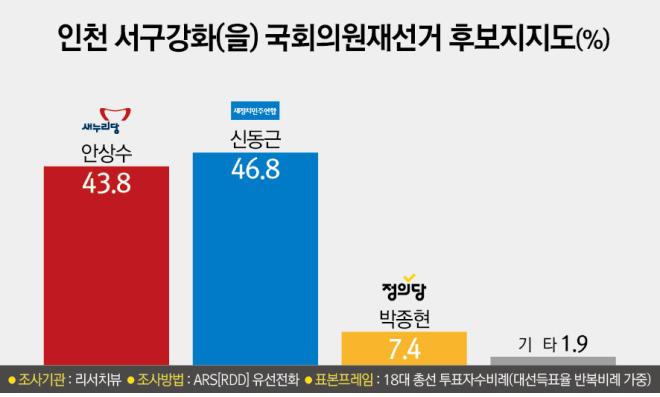 새누리당 강세지역으로 평가받는 인천 서구ㆍ강화(을)은 새정치민주연합 신동근 후보가 새누리당 안상수 후보를 오차범위 내에서 앞서며 이번 재보선 최대 관심지역으로 떠올랐다.