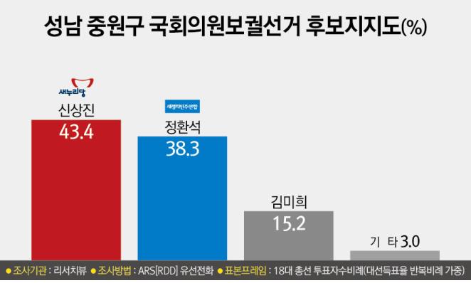 ▲ 성남 중원 “신상진(43.4%) vs 정환석(38.3%)”, 신상진 5.1%p 앞서