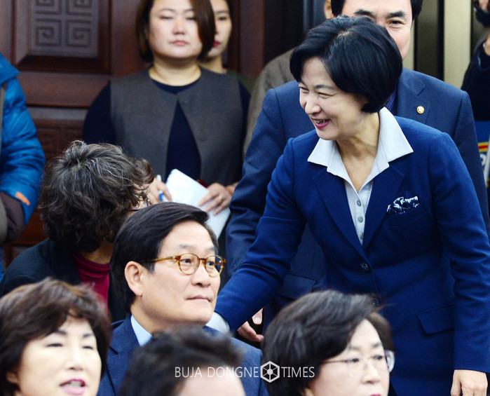 16일 오전 서울 여의도 국회에서 열린 더불어민주당 의원총회에서 추미애 대표가 의원들과 인사를 나누고 있다. 2017.02.16.