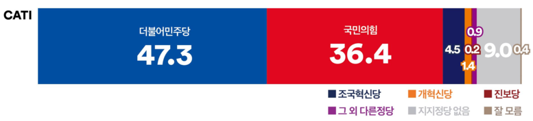 권역별로 살펴보면, ‘더불어민주당’은 호남권에서 71.3%의 압도적인 지지를 얻었으며, 서울(45.0%), 경인권 (51.8%), 충청권(45.9%)에서도 ‘국민의힘’을 앞섰다. 반면, ‘국민의힘’은 대구·경북(53.5%)과 부·울·경(46.8%)에서 상대적으로 높은 지지를 받으며 강세를 보였다.