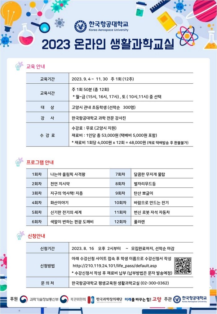 생활과학교실은 과학기술정보통신부, 복권위원회, 한국과학창의재단과 고양시의 지원을 받아 한국항공대학교에서 운영된다. 수강료는 전액 무료(재료비 제외)이다.