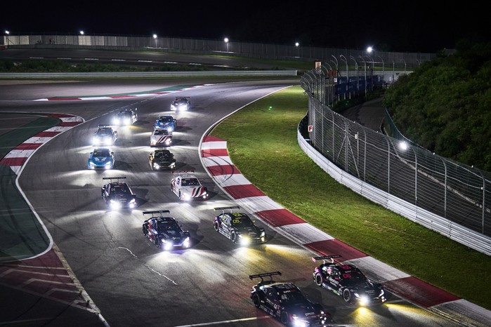 [사진 설명] 지난 4라운드 나이트 레이스에서 포메이션랩을 돌고 있는 슈퍼 6000 차량의 모습.