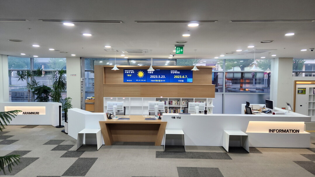 아람누리도서관은 통합 안내데스크 설치와 종합자료실 환경개선 공사를 함께 진행했다. 통합 안내데스크는 1층 로비에 조성하고, 전자 광고판, 스마트 반납 서가 등을 설치해 이용자 편의를 높였다. 종합자료실은 노후 집기를 교체하고, 책 추천 서가 제작 등 공간 개선으로 이용자 열람 공간을 확보했다.