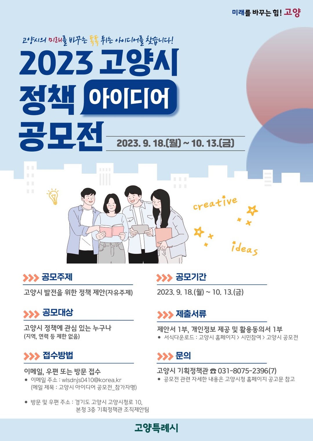 [부자동네타임즈 = 김인수 기자] 고양시의 미래를 바꿀 작지만 발전적인 아이디어를 발굴하기 위해 9월 18일부터 10월 13일까지 ‘2023년 고양시 정책 아이디어 공모전’을 진행한다.