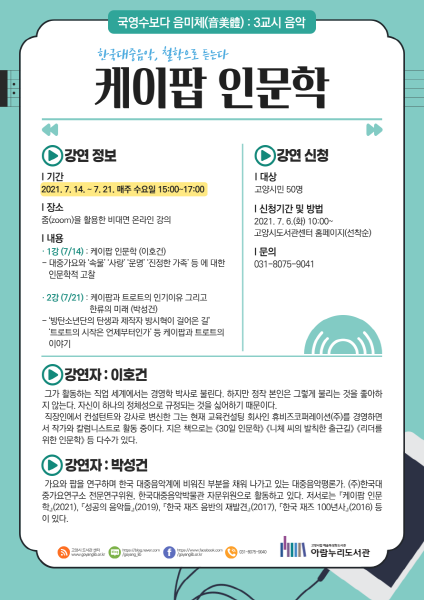 수강 신청은 오는 7월 6일 오전 10시부터 고양시 도서관센터 홈페이지에서 하면 된다. 한편, 아람누리도서관은 국영수보다 음미체(音美體) 예술특화프로그램을 운영하고 있다. 첫 번째 강의는 체육 분야‘축구’를, 두 번째는 미술 분야 ‘동양미술’을 그리고 세 번째이자 마지막 강의로 이번 대중음악 ‘케이팝’강연을 진행한다.