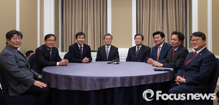 △ 여야 지도부가 지난 10일 오후 서울 여의도 국회 귀빈식당에서 국회의원 선거구 확정 등 논의를 위한 회동에 앞서 취재진을 향해 포즈를 취하고 있다.