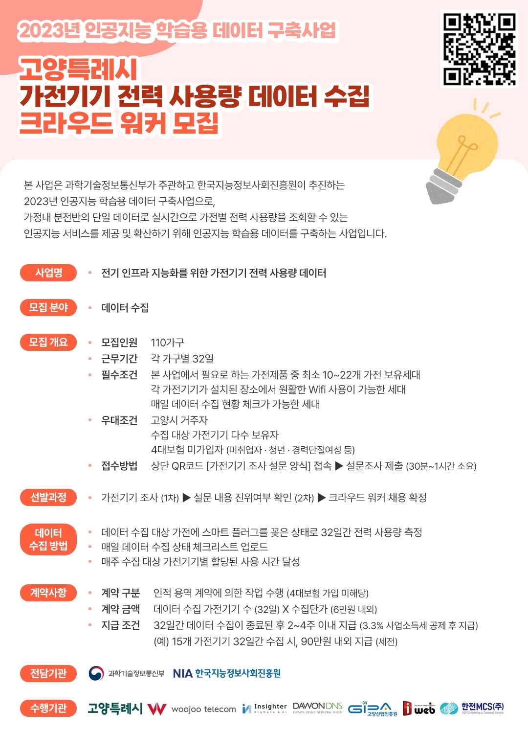 시는 고양시민 중에서 미취업자, 청년, 경력단절여성 등 취약 계층을 우선적으로 선발할 계획이다. 데이터 수집 신청은 모집 포스터 상단의 QR코드를 촬영하면 된다.