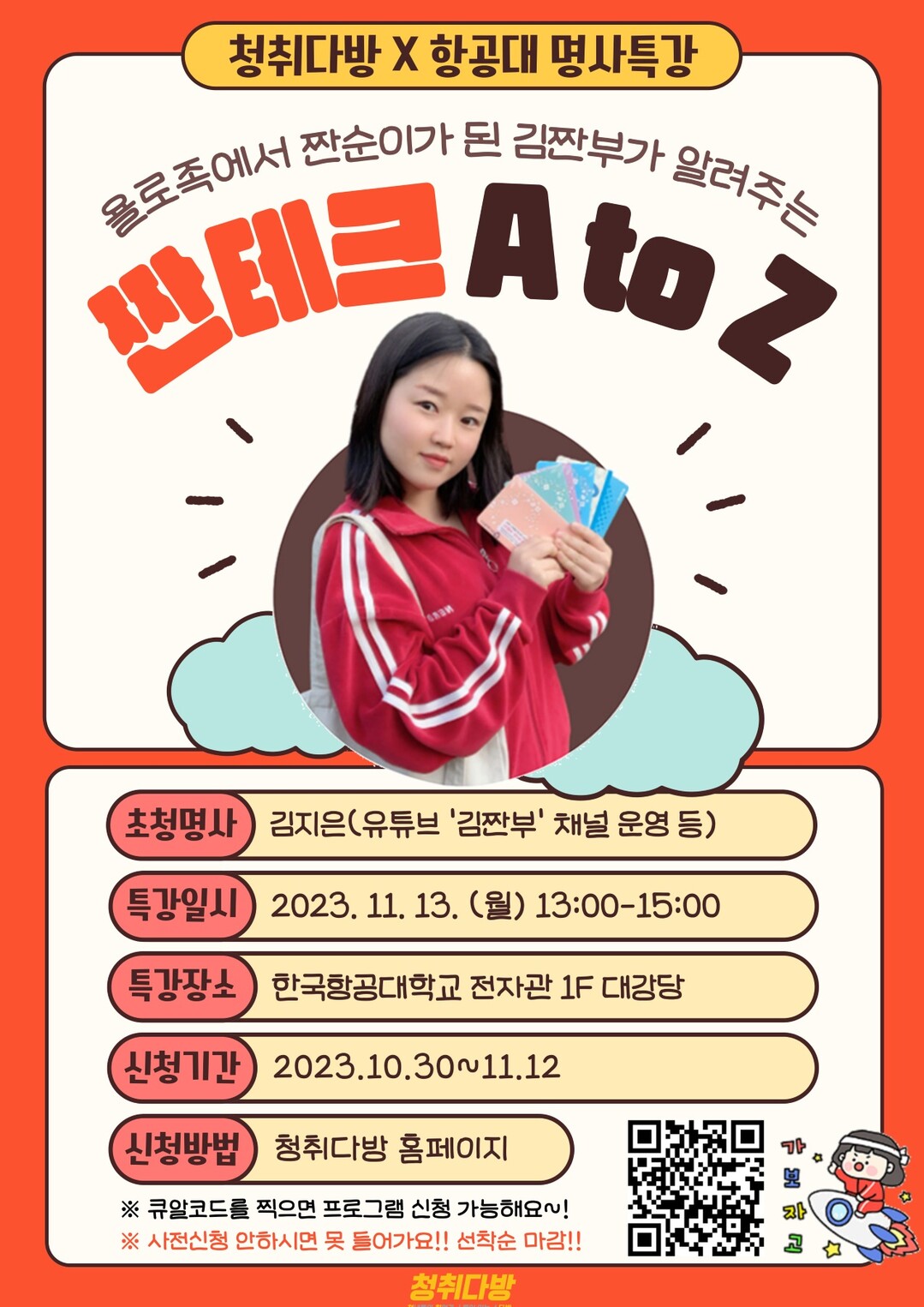 [부자동네타임즈 = 김인수 기자] 오는 13일 오후 1시에 한국항공대학교 전자관 1층 대강당에서 재테크 분야 인기 유튜버 ‘김짠부’를 초청해 특강 ‘짠테크 에이 투 제트(A to Z)’를 개최한다.